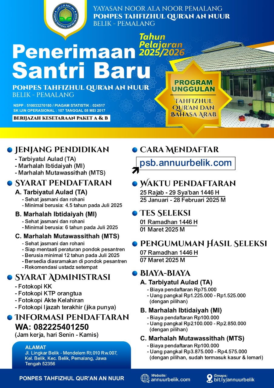 telah dibuka penerimaan santri baru untuk tahun pelajaran 2025/2026, dengan ketentuan sebagai berikut :